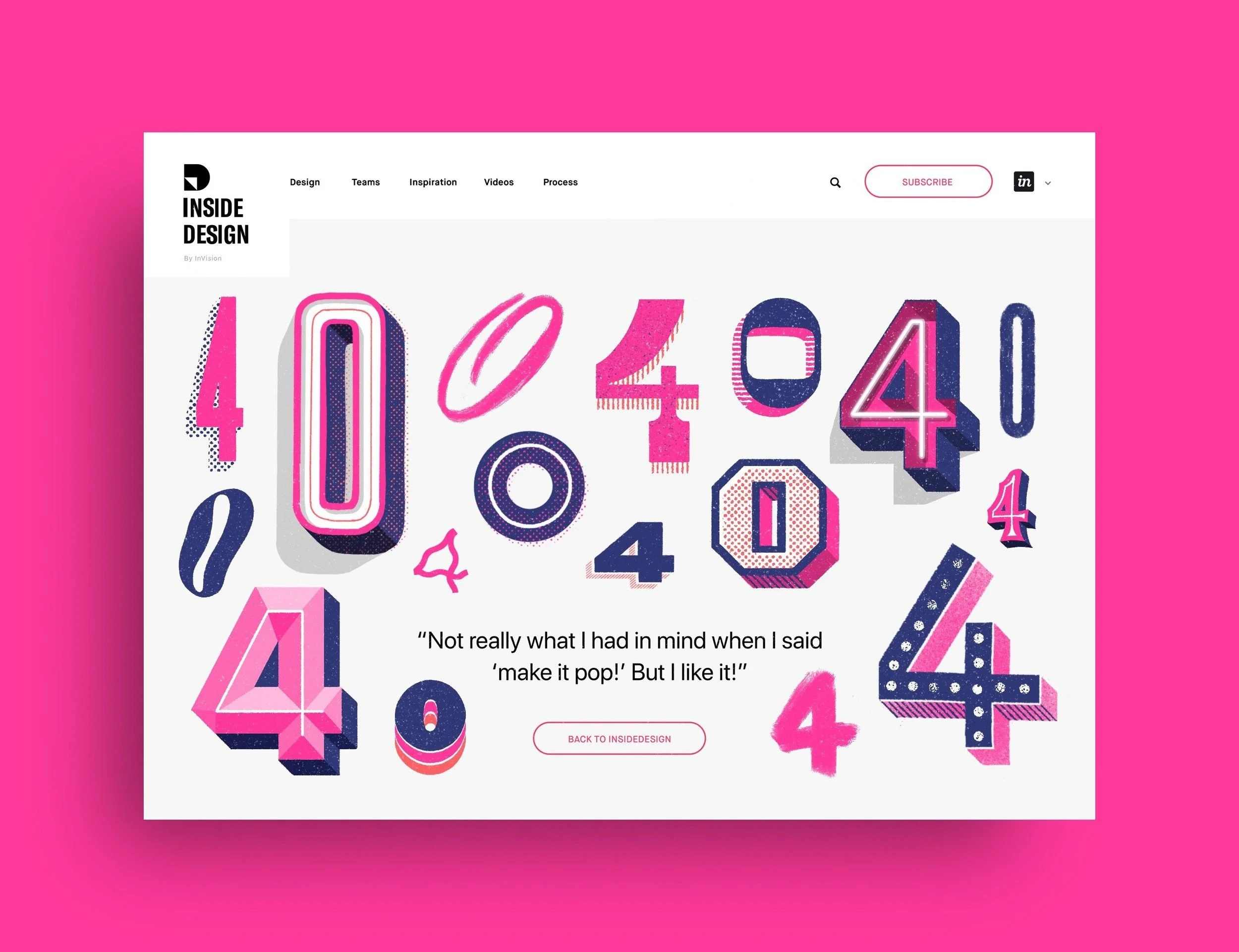 Various projects completed with Invision, including editorial illustrations and a bespoke 404 page.