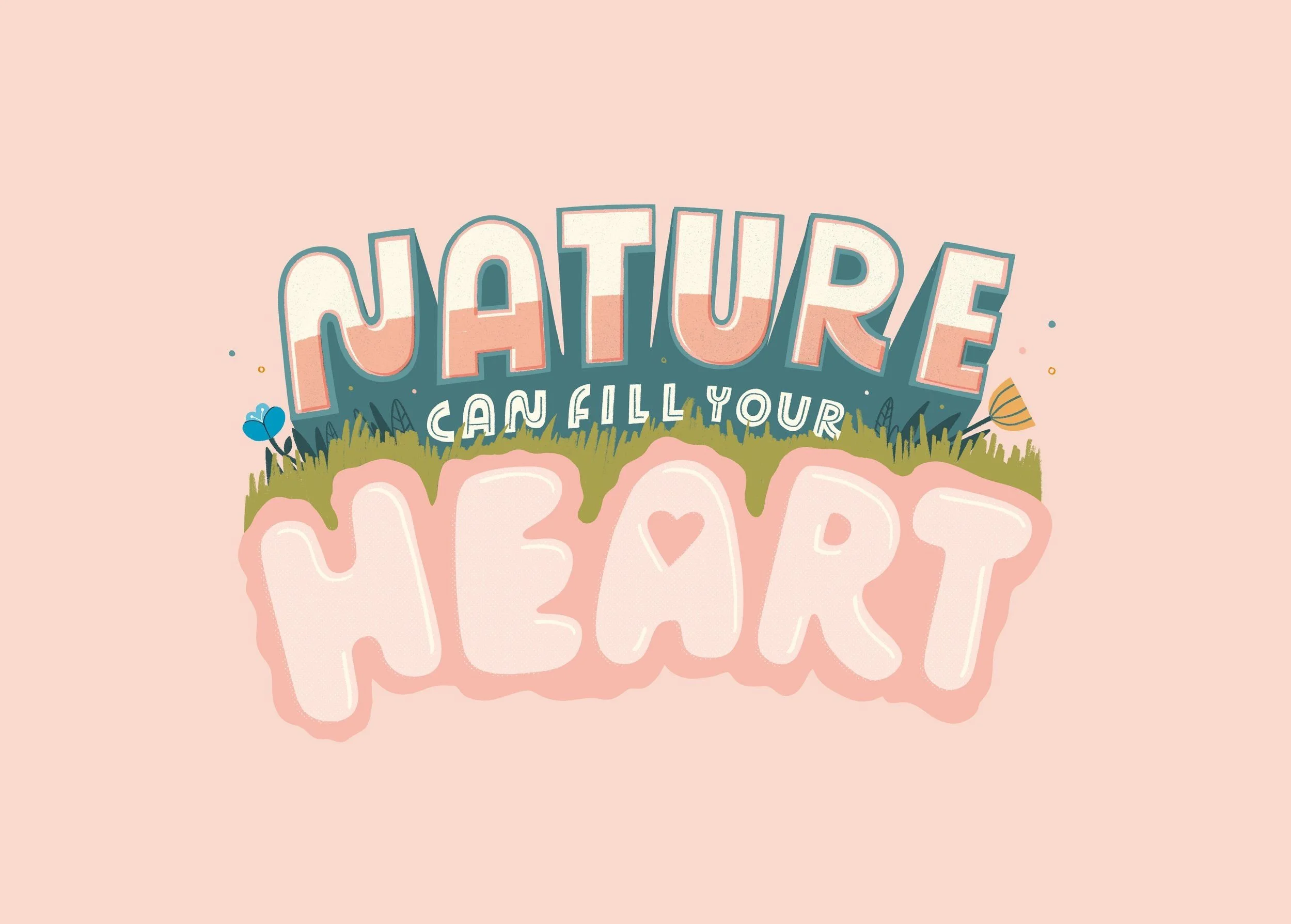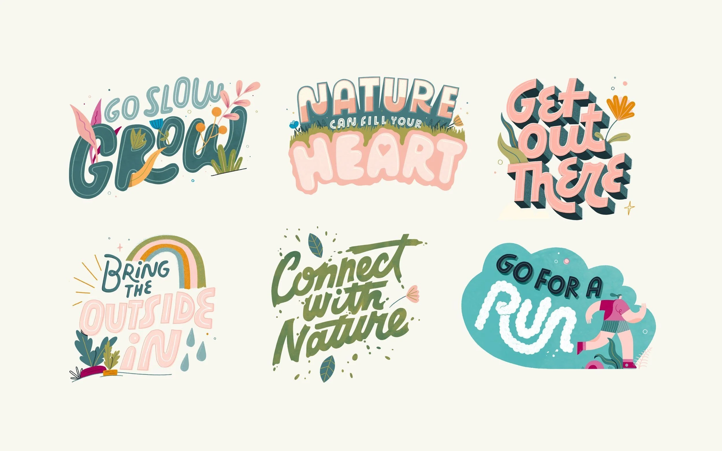 For Mental Health Week 2021, the focus was all about connecting with nature. I was commissioned by Flow to create a series of positive hand lettered phrases to uplift people and inspire them to find out more and get involved.